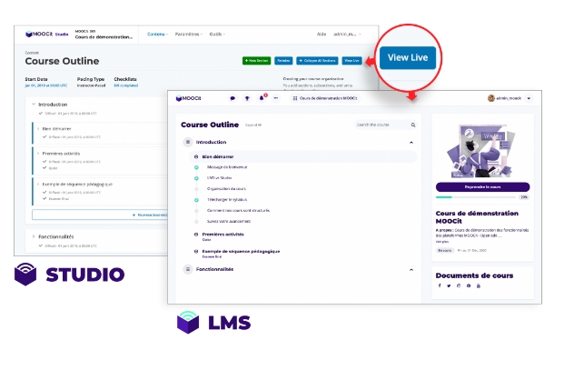 L'accès pour créer / modifier le cours se fait dans MOOCit Studio, le LMS est le lien yourbusinessname.moocit.fr qui est le point d'accès de l'apprenant. Vous pouvez également accéder au LMS en ouvrant votre cours dans Studio et en sélectionnant «Afficher en direct».