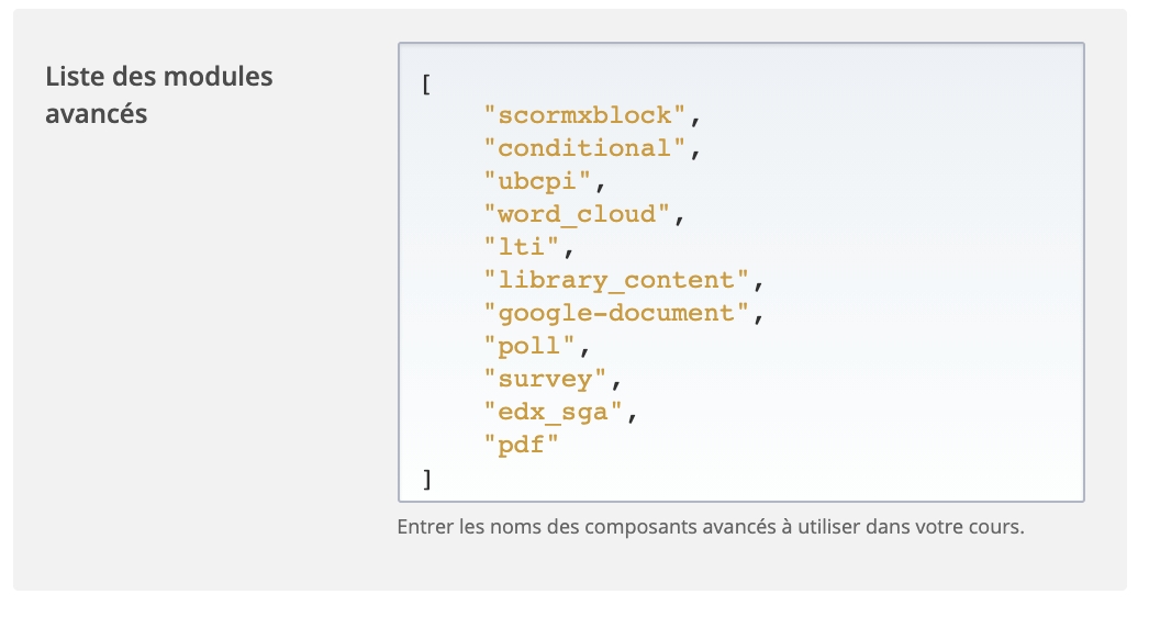 Recherchez le champ Liste des modules avancés. Ce champ répertorie tous les exercices et outils qui ont été ajoutés à votre cours.