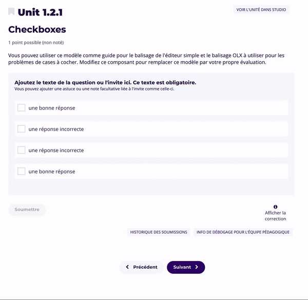 Voici comment apparaît Afficher la correction dans la vue de l'apprenant: