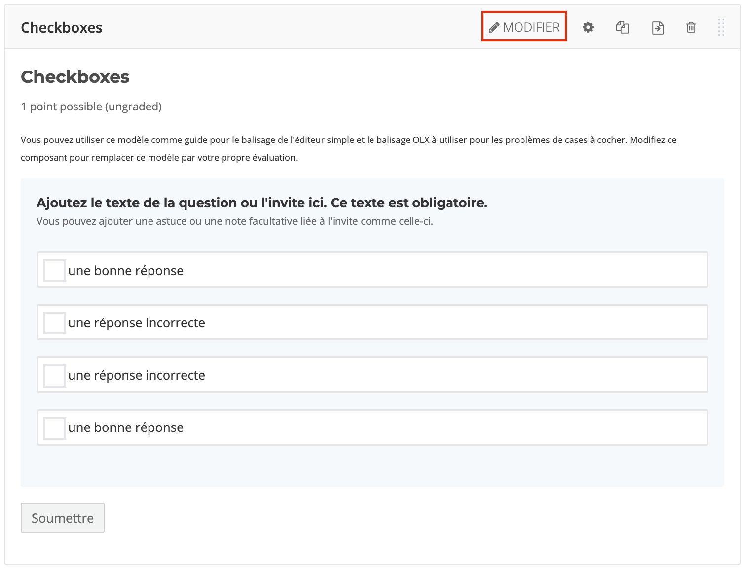 Tentative: le bouton Afficher la correction est visible une fois que la question a été répondue au moins une fois