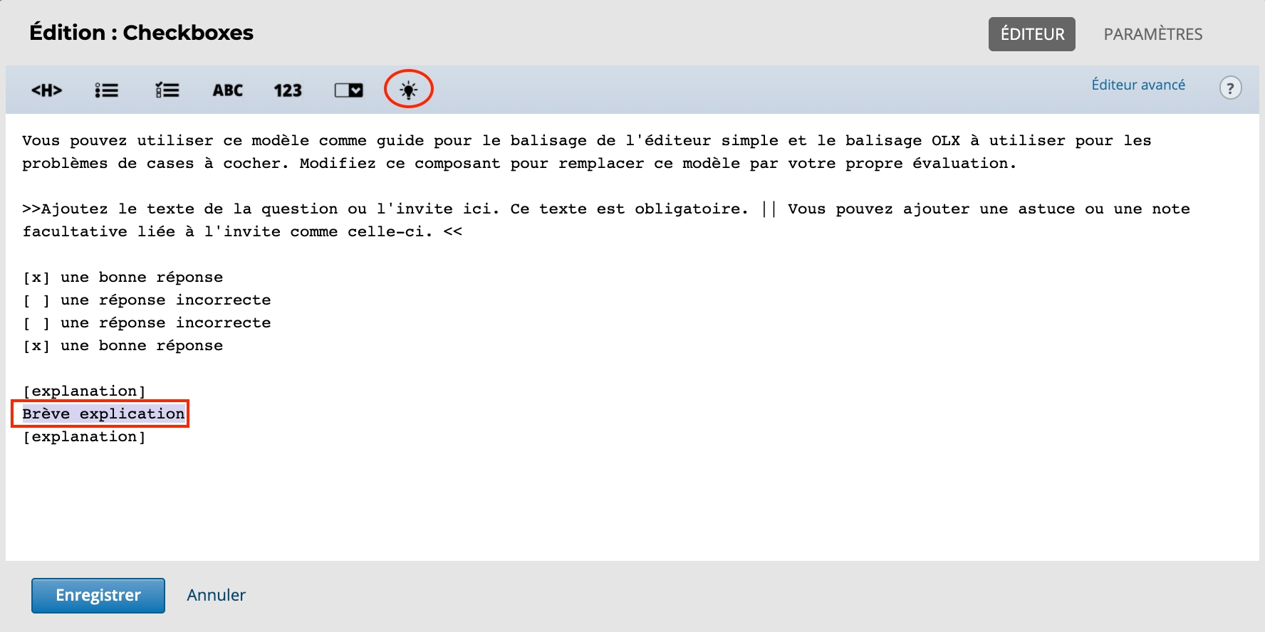 2) Sélectionnez l'icône 💡 «ampoule» pour ajouter une «explication» sous une question. Ensuite, modifiez le texte «brève explication».