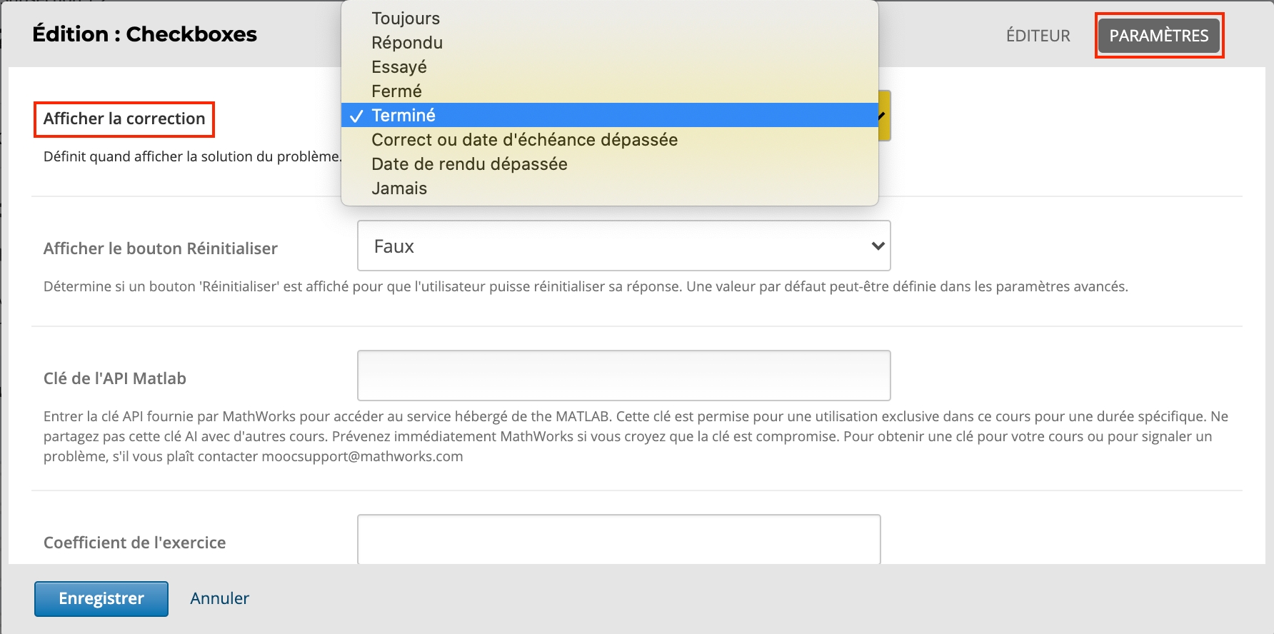Les valeurs disponibles pour 'Afficher la correction'