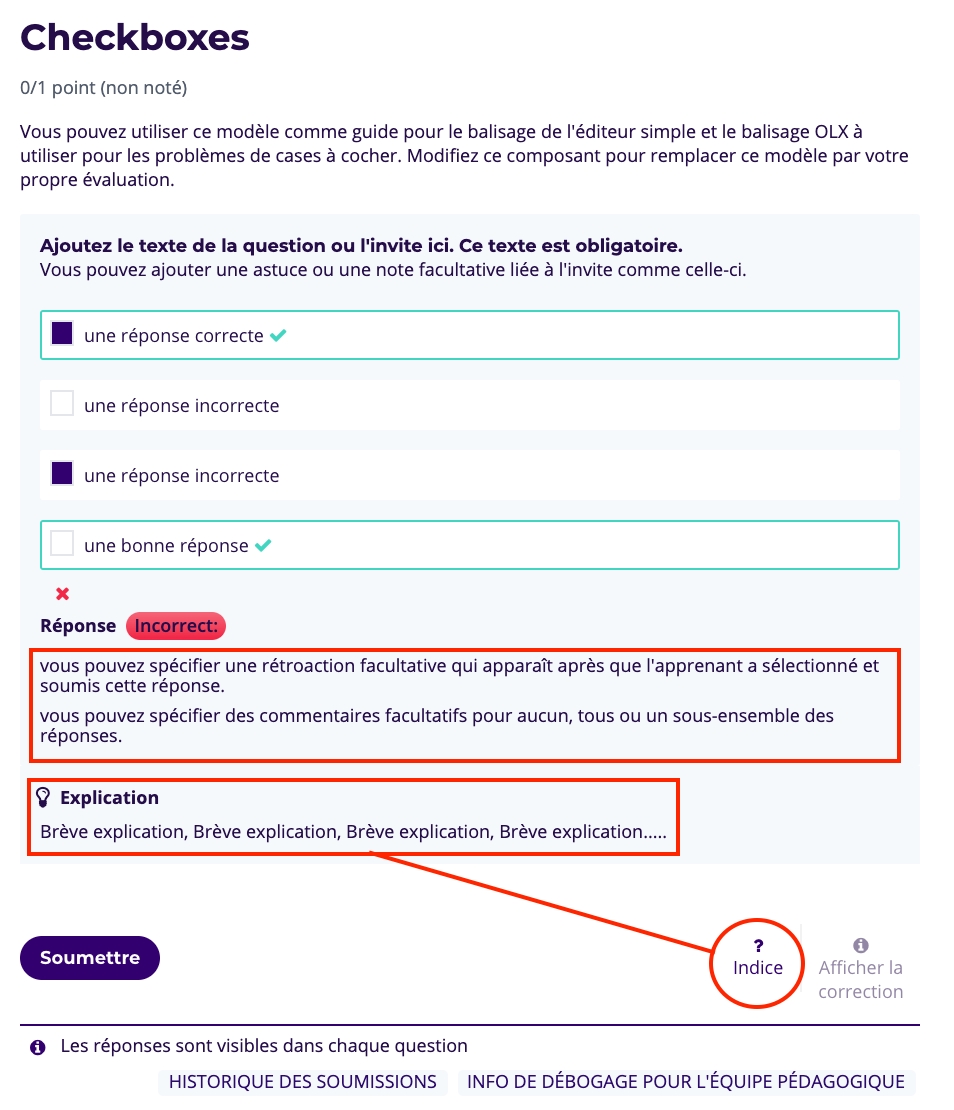 [x] une réponse correcte {{selected: spécifiez une rétroaction facultative qui apparaît après que l'apprenant a sélectionné et soumis cette réponse. }, {non sélectionné: spécifiez les commentaires facultatifs qui apparaissent après que l'apprenant a effacé et soumis cette réponse.}}
