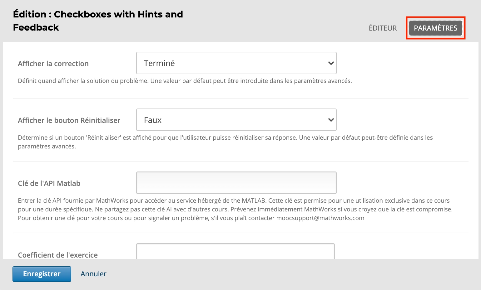 Coefficient de l'exercise - Définit le nombre de points que chaque problème vaut. Si la valeur n'est pas définie, chaque champ de réponse du problème vaut un point.
